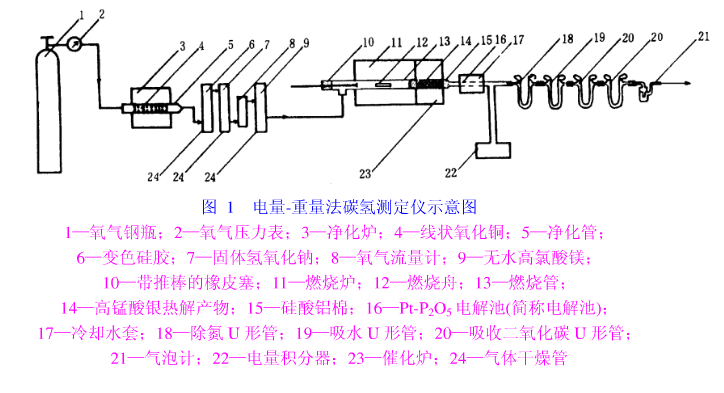 電量-重量法碳?xì)錅y(cè)定儀(簡(jiǎn)稱測(cè)定儀)由氧氣凈化系統(tǒng)、燃燒裝置、鉑-五氧化二磷電解池、電量積分器和吸收系統(tǒng)等構(gòu)成。測(cè)定儀結(jié)構(gòu)如圖1所示。
