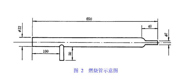 2.2 燃燒管:總長(zhǎng)約650mm,一端外徑約22mm,內(nèi)徑約19mm、長(zhǎng)約610mm,距管口約100mm外接有外徑約8mm、內(nèi)徑約6mm,長(zhǎng)約50mm的支管;另一端外徑7mm、內(nèi)徑約3mm、長(zhǎng)約40mm的異徑石英管(見圖2)