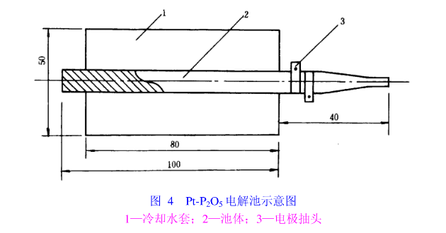 長(zhǎng)約100mm,外徑約8mm,內(nèi)徑約5mm的專用電解池(見圖4),鉑絲間距約0.3mm,池內(nèi)表面涂有五氧化二磷。電解池外有外徑約50mm,內(nèi)徑9mm~10mm,長(zhǎng)約80mm的冷卻水套。