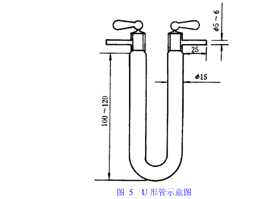 5.2 吸水U形管:如圖5.直徑約15mm的U形管,內(nèi)裝無水高氯鎂或無水氯化鈣,裝藥部分高100mm~120mm。