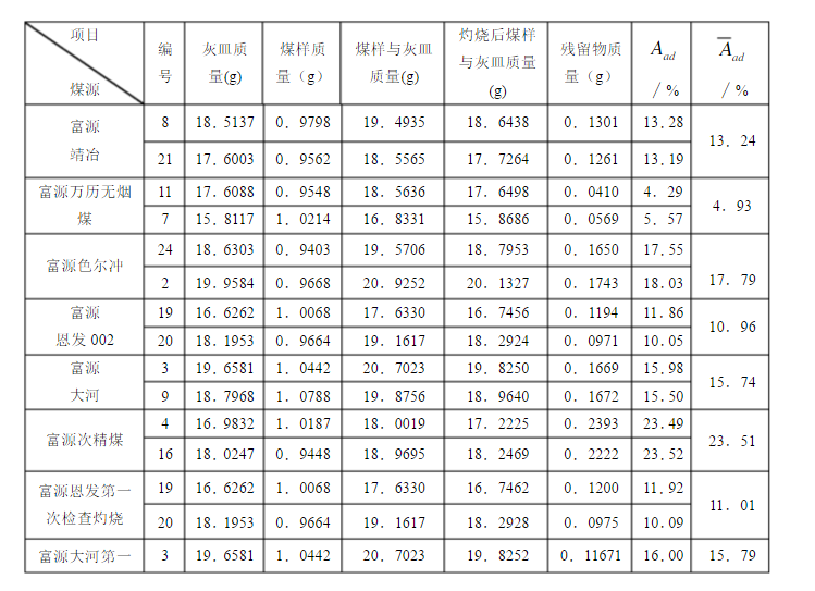 將裝有煤樣的灰皿放在預先加熱至815 ºC左右的灰分快速測定儀的傳送帶上,煤樣自動送入儀器內完全灰化,然后送出。以殘留物占煤樣的質量分數作為煤樣的水分。